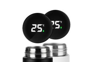 Botella térmica, acero inoxidable con acabado negro mate, doble pared aislante, mantiene bebidas calientes hasta 6 h y frías hasta 12 h, capacidad 500 ml, tapa inteligente con pantalla LED indicadora de temperatura, 23 cm de alto x 7 cm de diámetro, reutilizable.